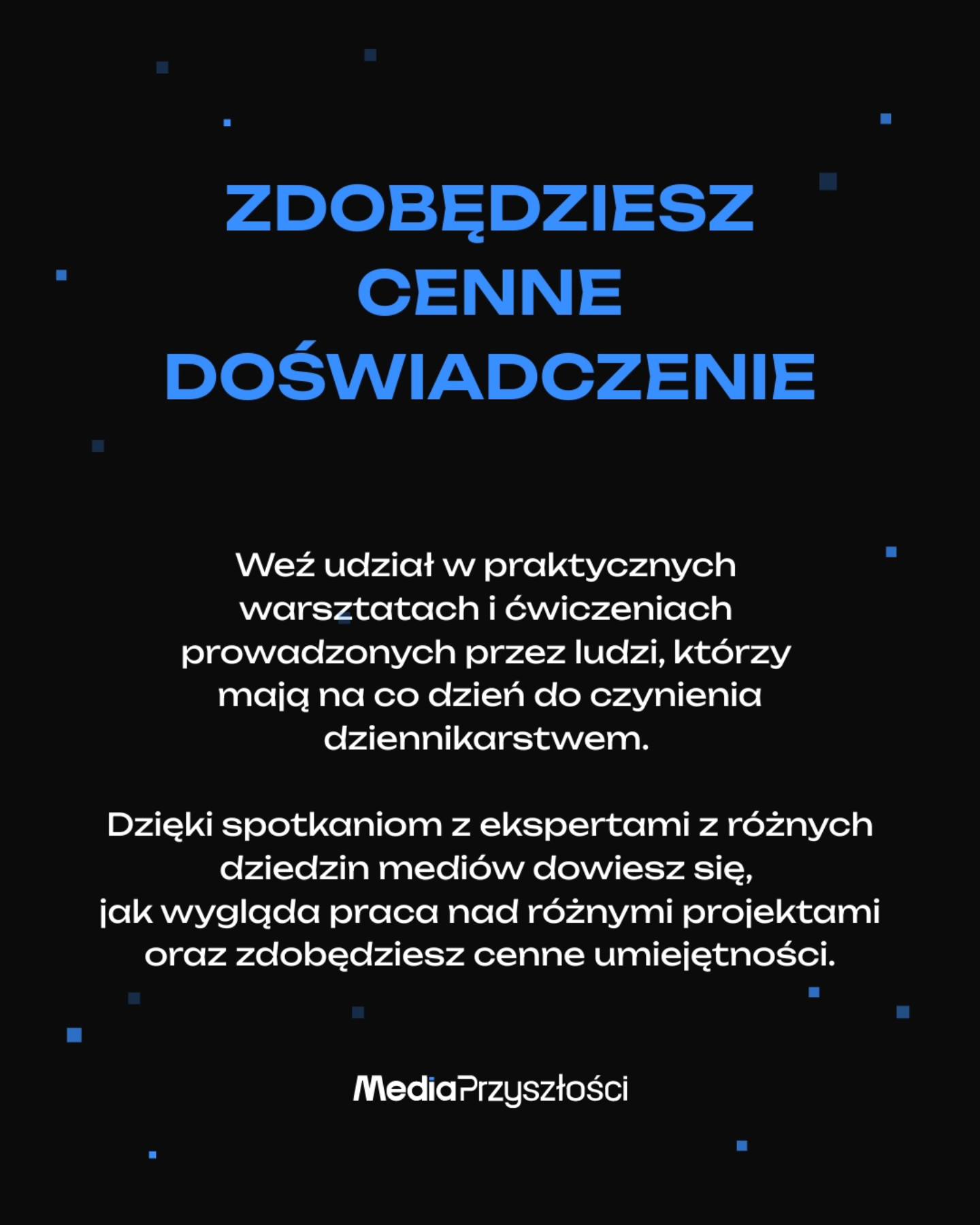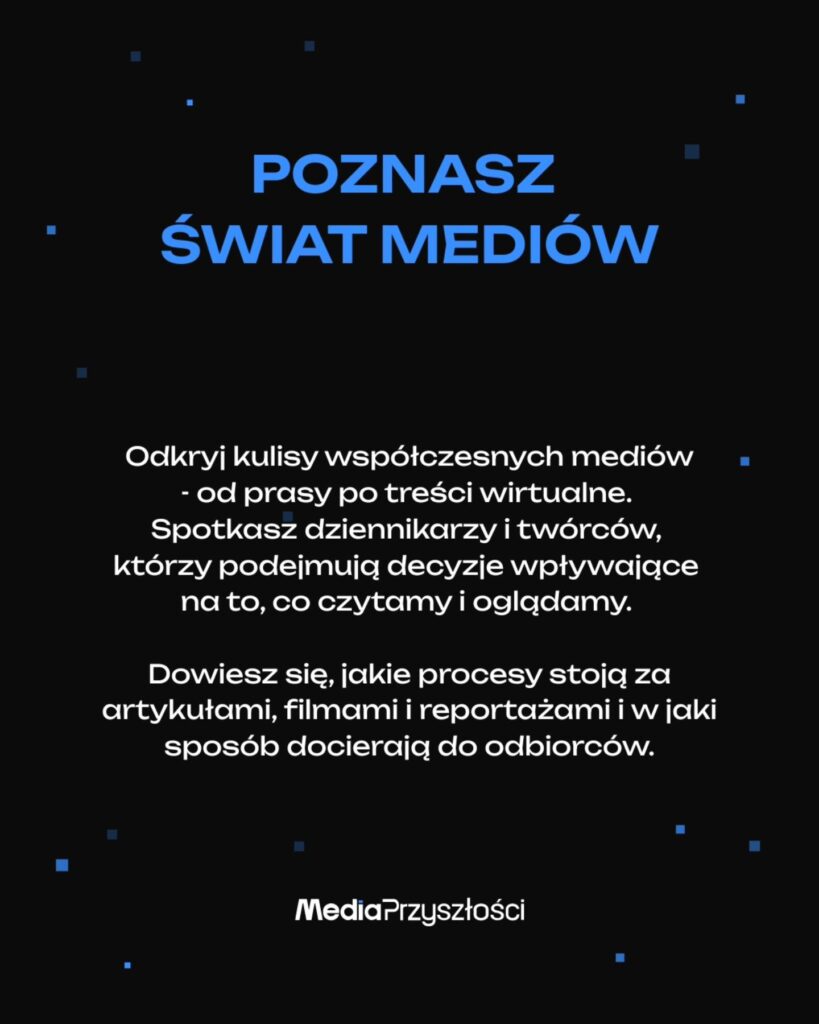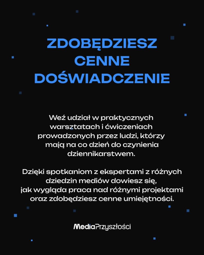 Zapraszamy wszystkich uczniów i uczennice szkół średnich i studentów oraz studentki, zainteresowanych/zainteresowane mediami, dziennikarstwem, komunikacją oraz nowymi technologiami – każdy znajdzie coś dla siebie!